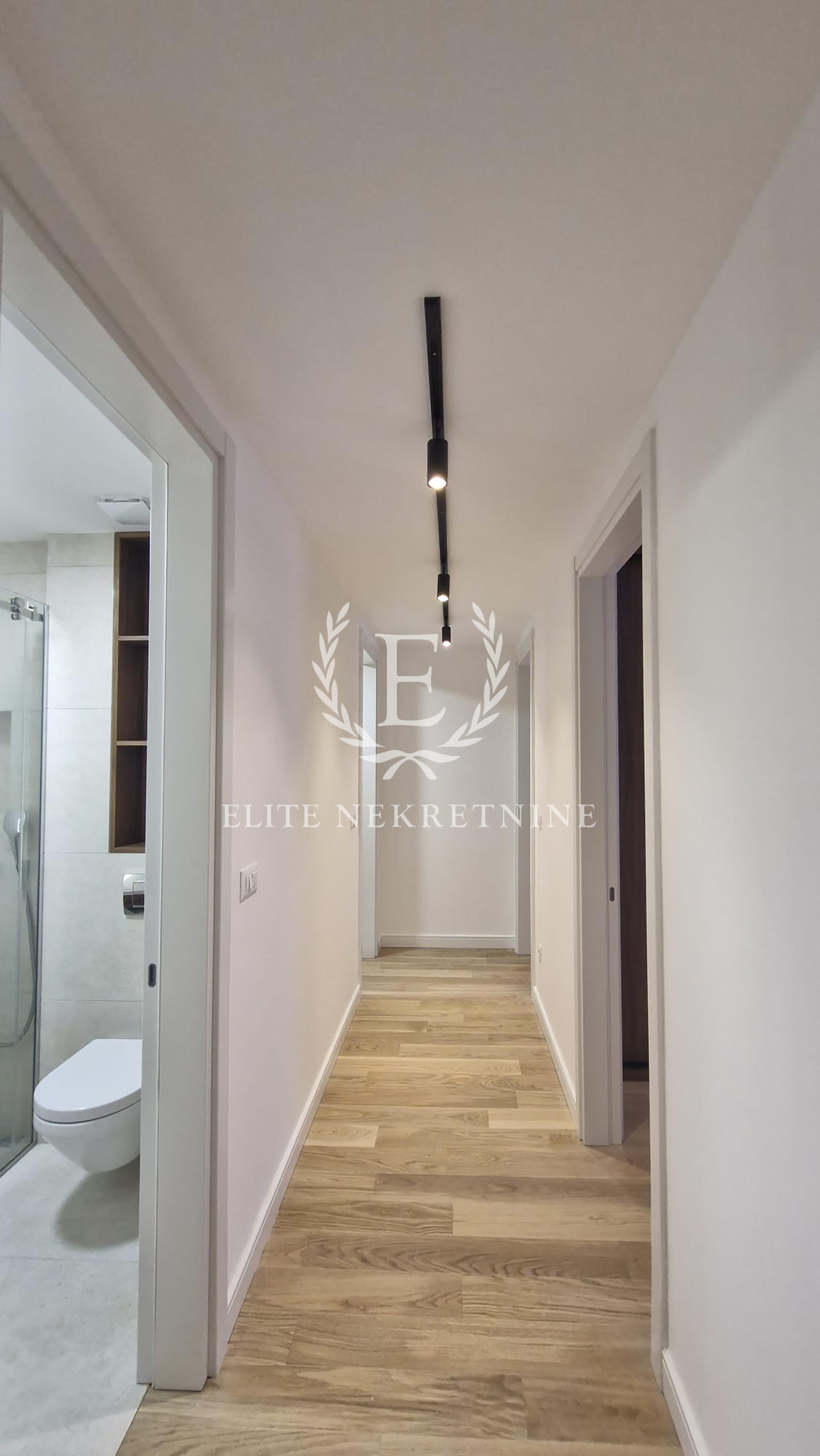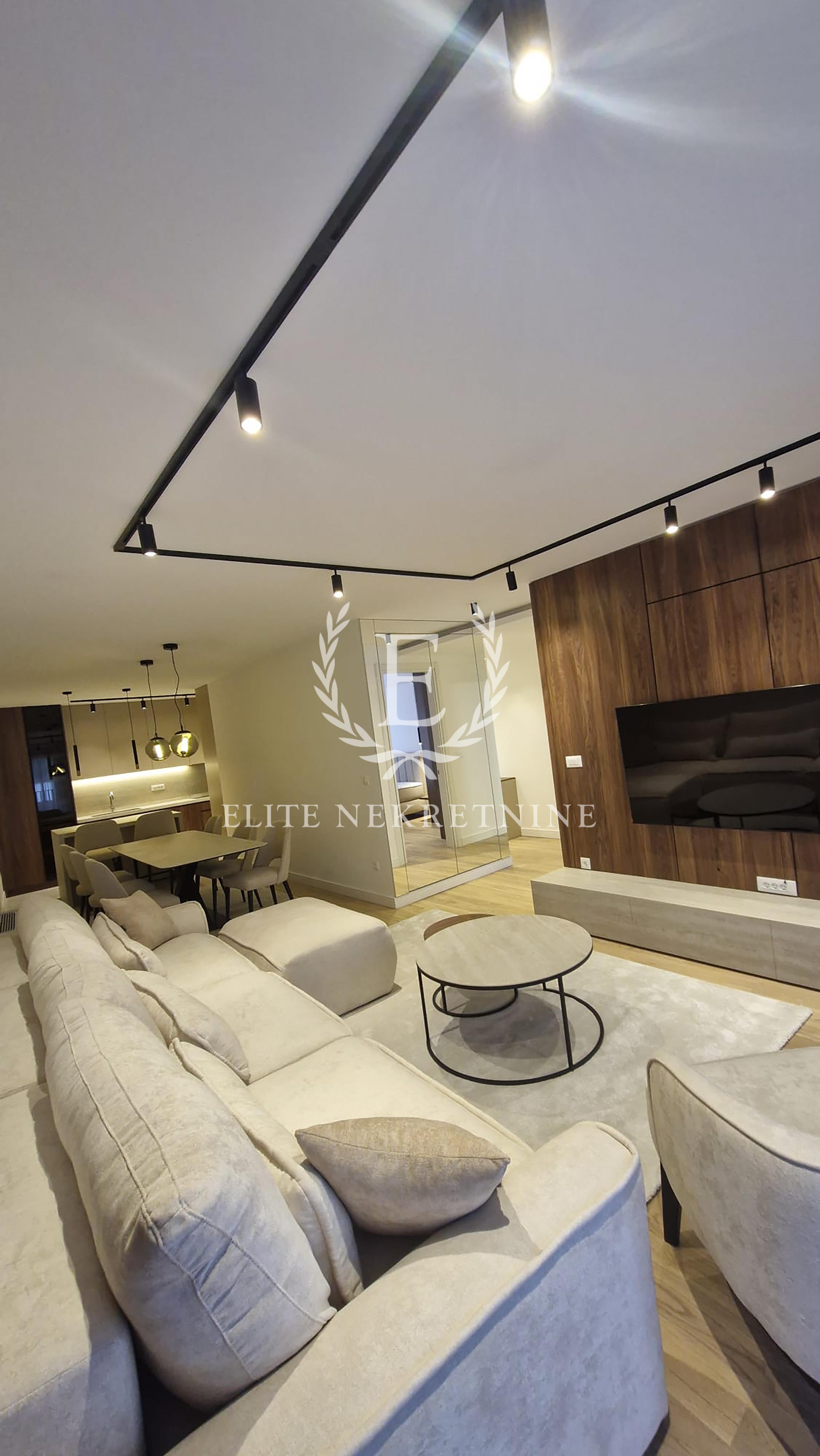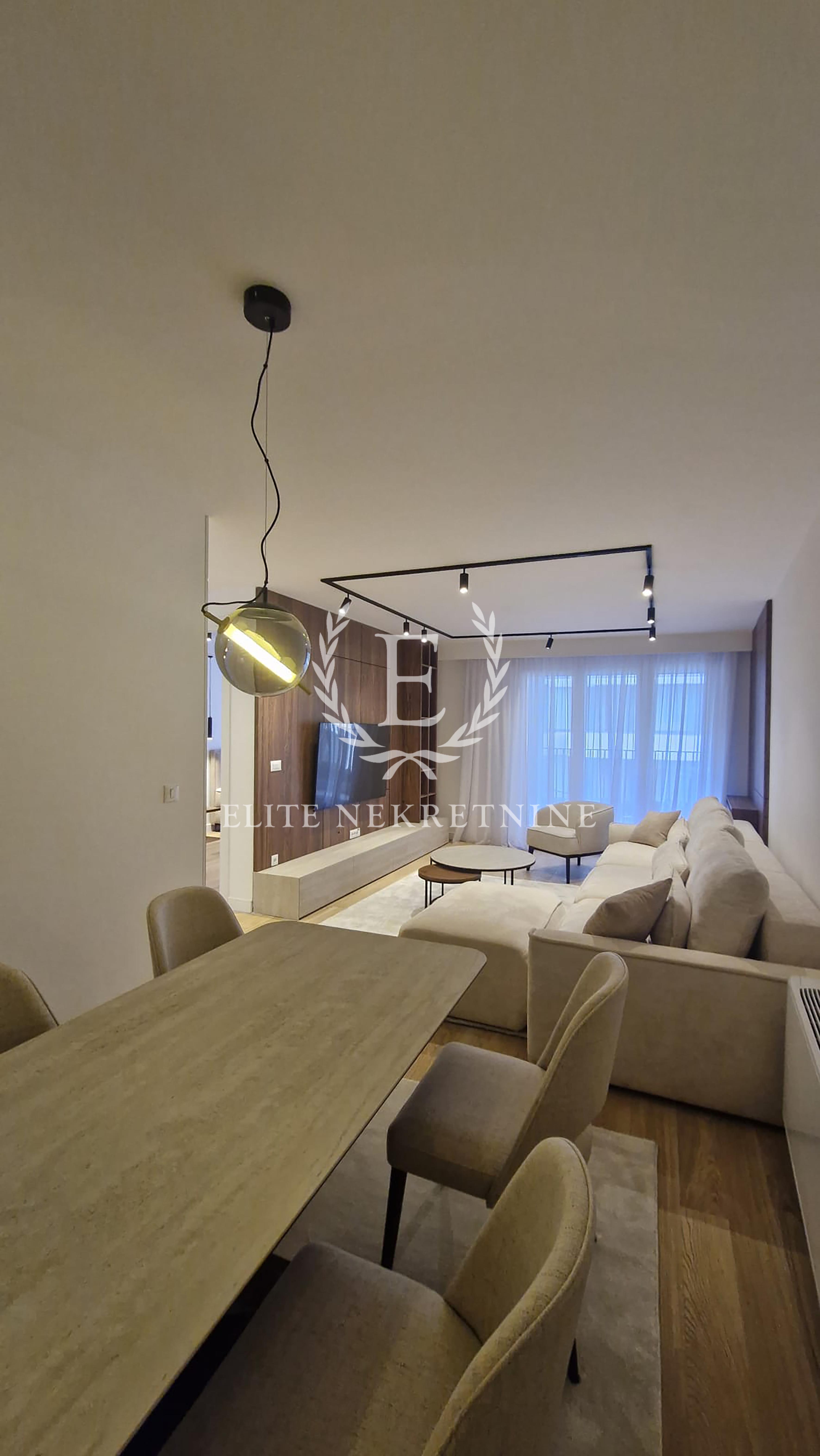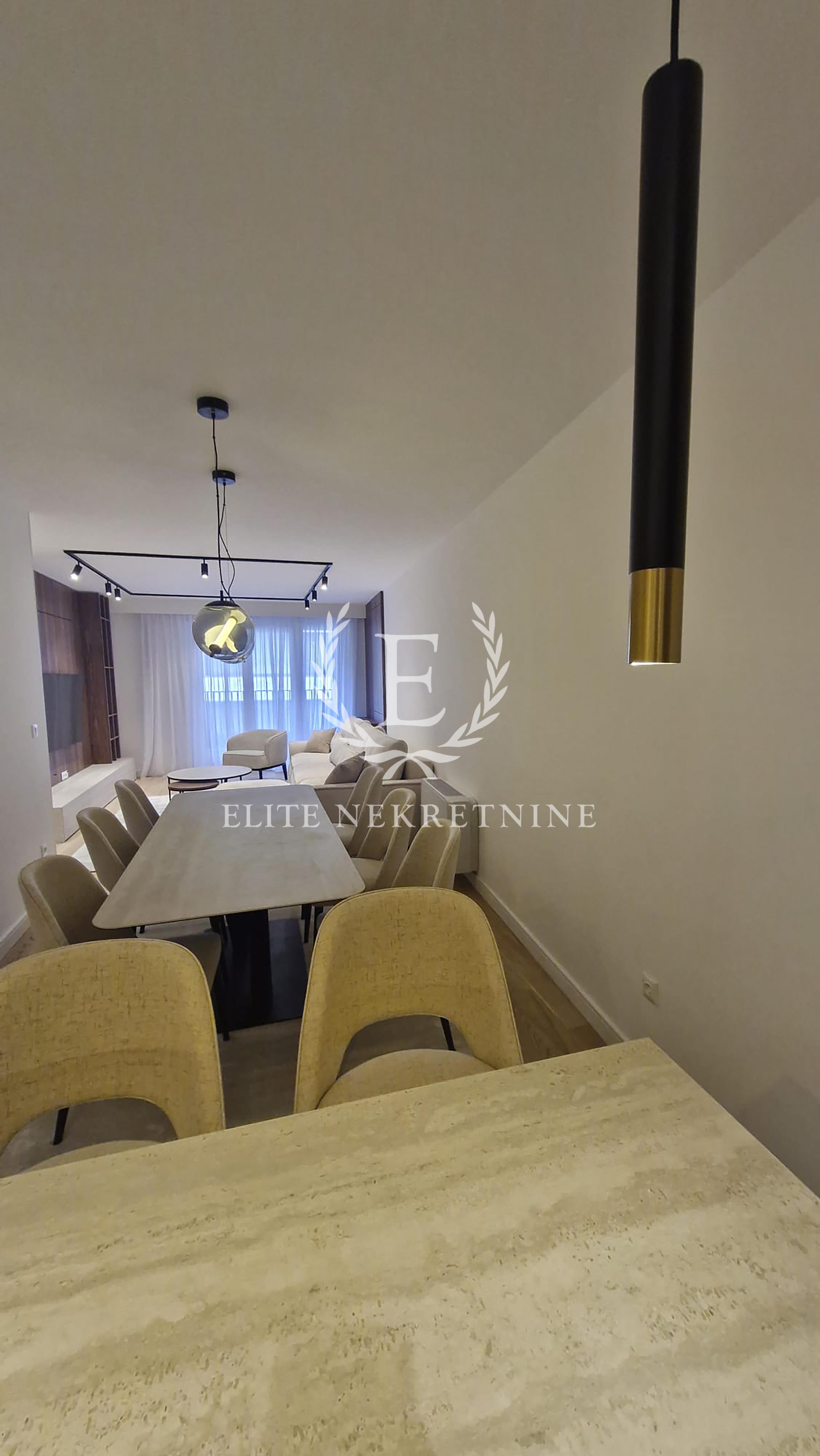 Stan se odlikuje izuzetnom prostornošću i obiljem prirodne svetlosti. Centralni deo čini elegantan dnevni boravak otvorenog koncepta, skladno povezan sa trpezarijom i savremeno dizajniranom kuhinjom, opremljenom aparatima najviše klase. Raspored obuhvata tri spavaće sobe, od kojih je jedna manjih dimenzija i idealna kao dečija soba, garderober ili radni prostor.