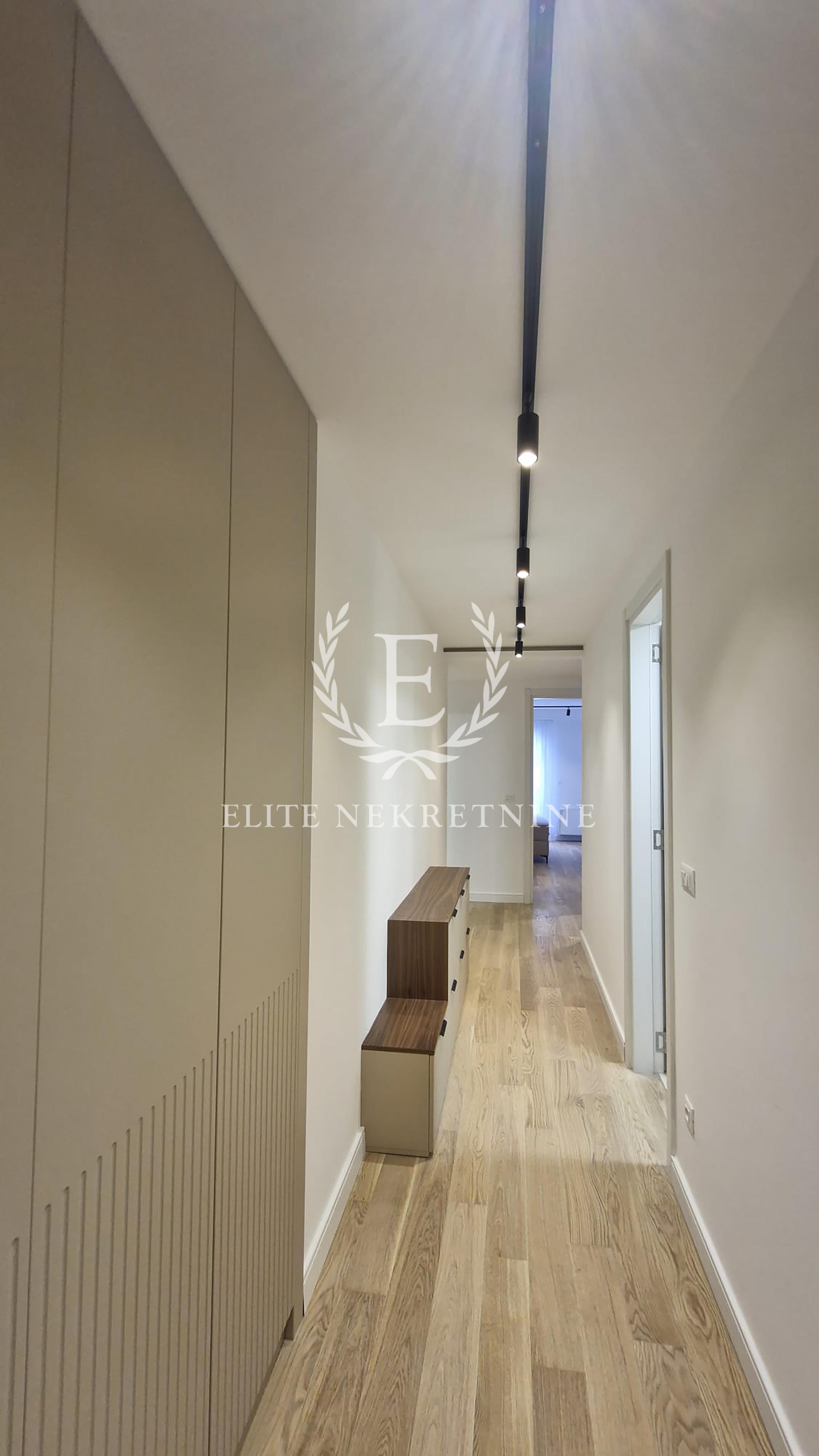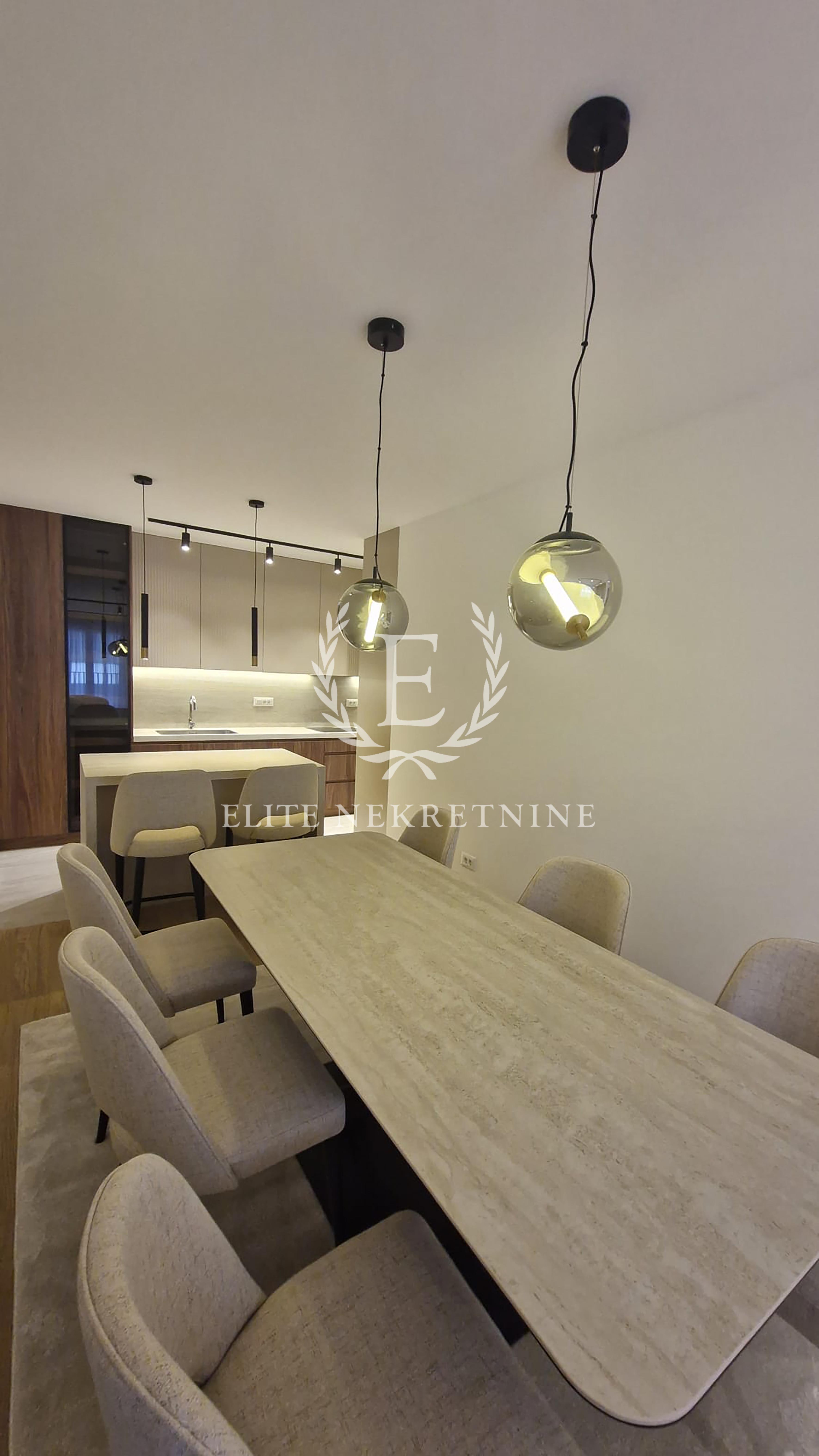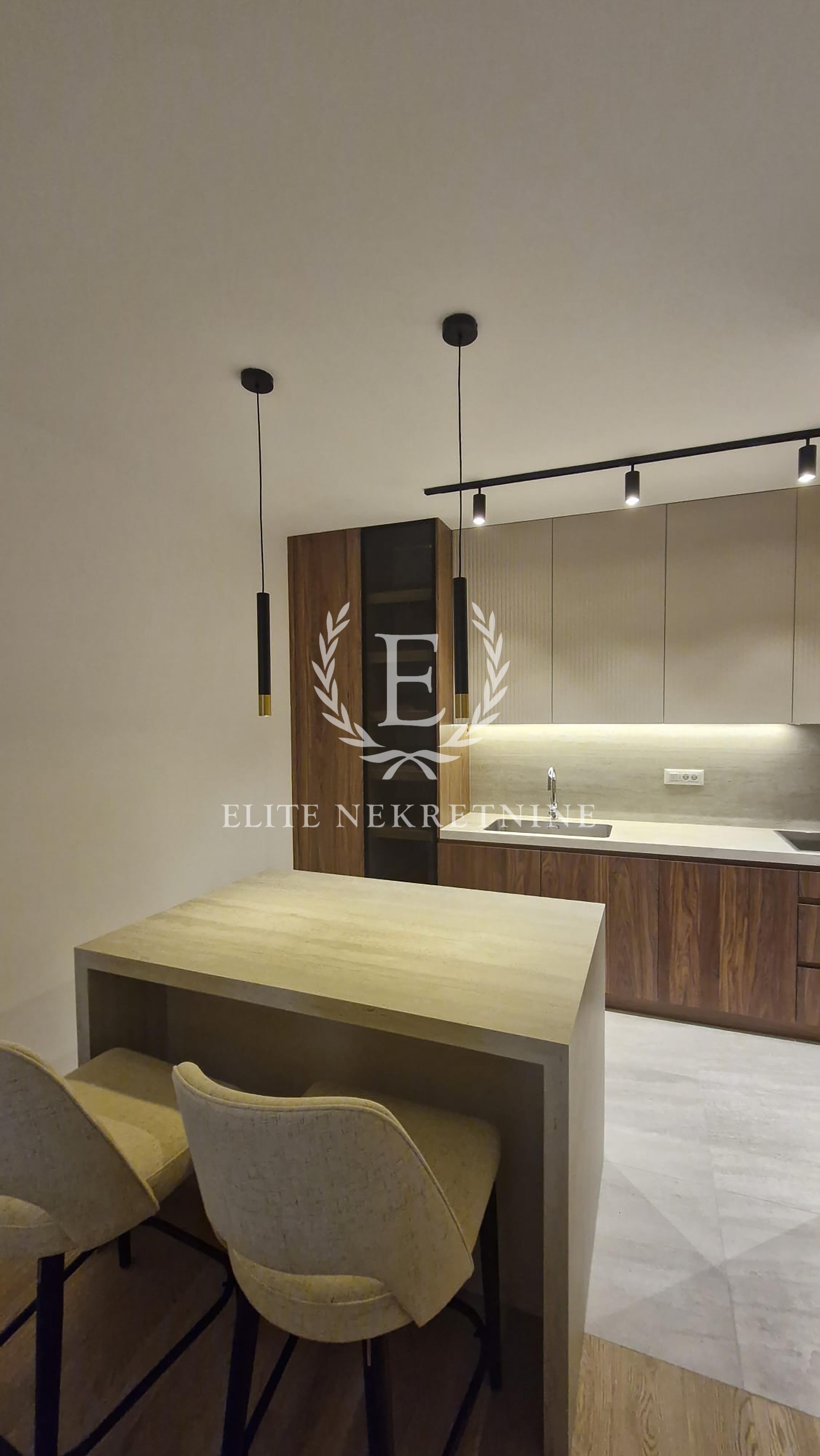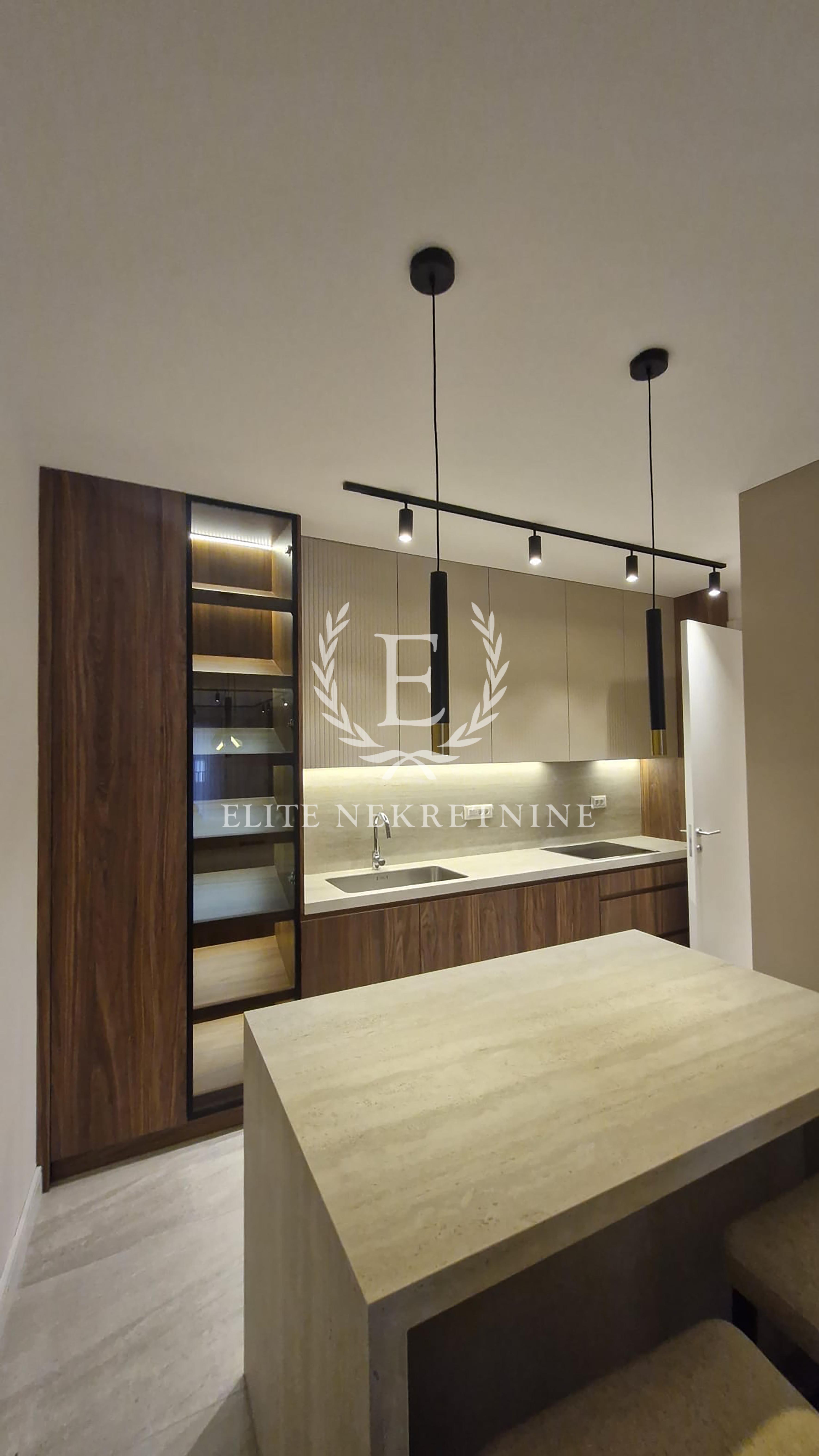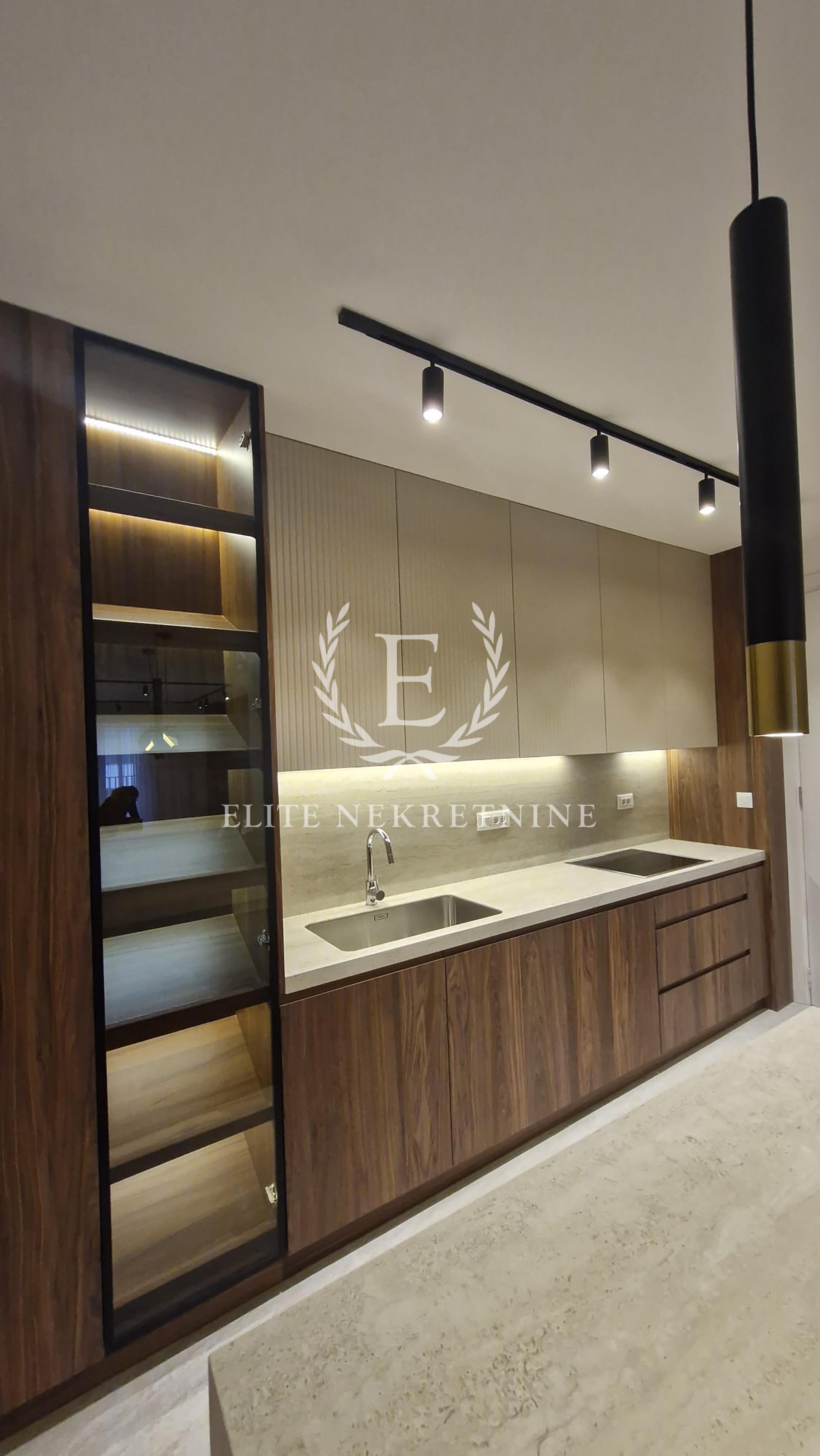 Enterijer je u potpunosti opremljen nameštajem i tehnikom vrhunskog kvaliteta, uz pažljivo odabrane materijale, tople drvene teksture i sofisticirano ambijentalno osvetljenje koje naglašava eleganciju i osećaj doma. Svaki detalj je promišljeno dizajniran kako bi prostor pružio maksimalan nivo udobnosti i estetike.